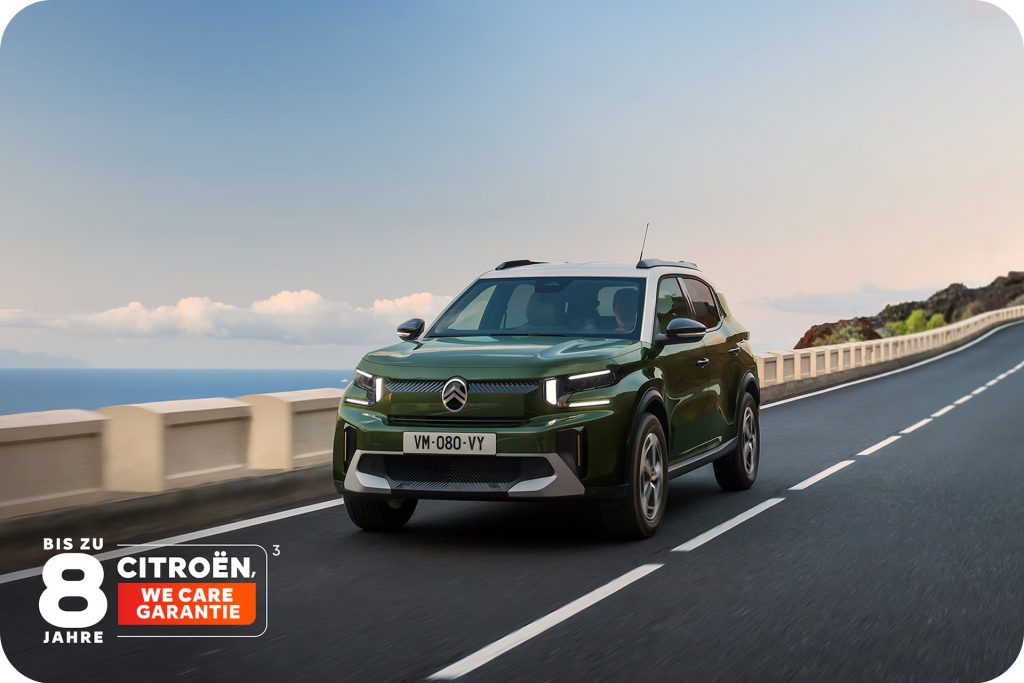 4 Finanzierungsprodukt 2-Wege-Finanzierung: Effektiver Jahreszins: 0 %, Sollzinssatz p.a. gebunden: 0 %, Angebot gültig bis 31.03.2026. Details bei allen teilnehmenden Citroën Partnern. Ein Finanzierungsangebot für Privatkunden (Bonität vorausgesetzt) der Stellantis Bank SA Niederlassung Deutschland, Siemensstraße 10, 63263 Neu-Isenburg, für die das Autohaus als ungebundener Vermittler tätig ist.